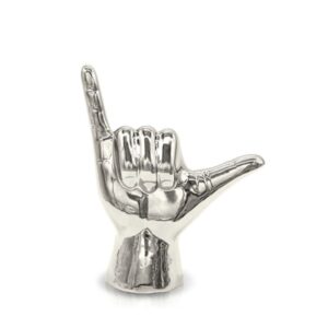Este gesto es conocido como Shaka. Se originó en originó en Hawái y se popularizó mundialmente gracias a la cultura del surf. Ideal para poner las llaves en la recepción de tu casa. También queda genial en estantes o apoyada en un escritorio o sobre un libro. Dónde esté te va tirar buena onda.
